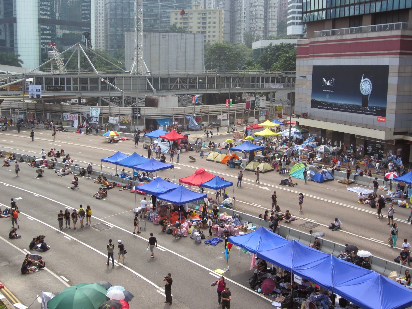 Also surprising was that we were able to walk right up to the demonstration - I have to admit that my heart was in my mouth as we walked past the barricaded streets, the usually bustling Central district eerily silent and deserted, I wasn't even sure if I should be taking pictures. No police in sight, as we walked on, past the students who had obviously spent the night on the streets, the banners and fliers covering the walls, the Red Cross tents, the food and water tents, the piles of garbage bags - all peaceful, there were some students singing, but most had pitched their tents on the roads, waiting...